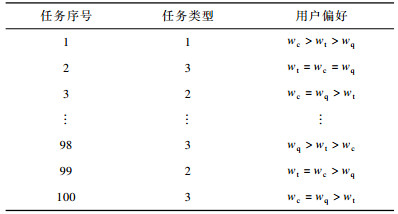 目前, 关于考虑用户偏好的云制造任务调度的研究较少, 其主要利用权重分配策略与启发式线性调度算法相结合的简单加权法。如:文献[8]根据用户偏好信息为目标分配偏好优先级, 据此获得量化的偏好权重, 并采用改进的免疫克隆算法获得最优调度方案; 文献[9]将用户提出的个性化任务要求分为功能性和非功能性两类, 据此获得更准确的用户偏好权重, 并采用改进的遗传算法获得最优调度方案; 文献[10]进一步考虑用户不同偏好的影响深度, 采用直觉模糊熵权法获得用户偏好权重, 并采用生物地理优化算法获得最优调度方案。然而, 用户偏好在应用中通常以定性的方式提供, 很难预先确定哪组定量权重是最合适的, 线性调度算法最终只提供一个最优解, 不能为决策者在实际决策中提供备选方案。