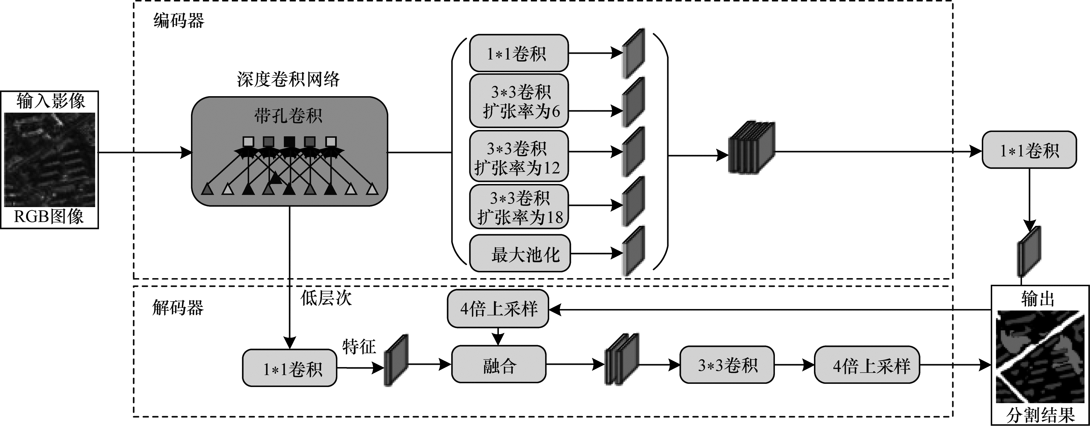 1 基于Deeplabv3+的遥感影像分割 1.1 Deeplabv3+原理文献[11]提出的Deeplabv3+是Deeplab系列中的最新版本, 其采用编码器-解码器的方式, 原理如图 1所示。