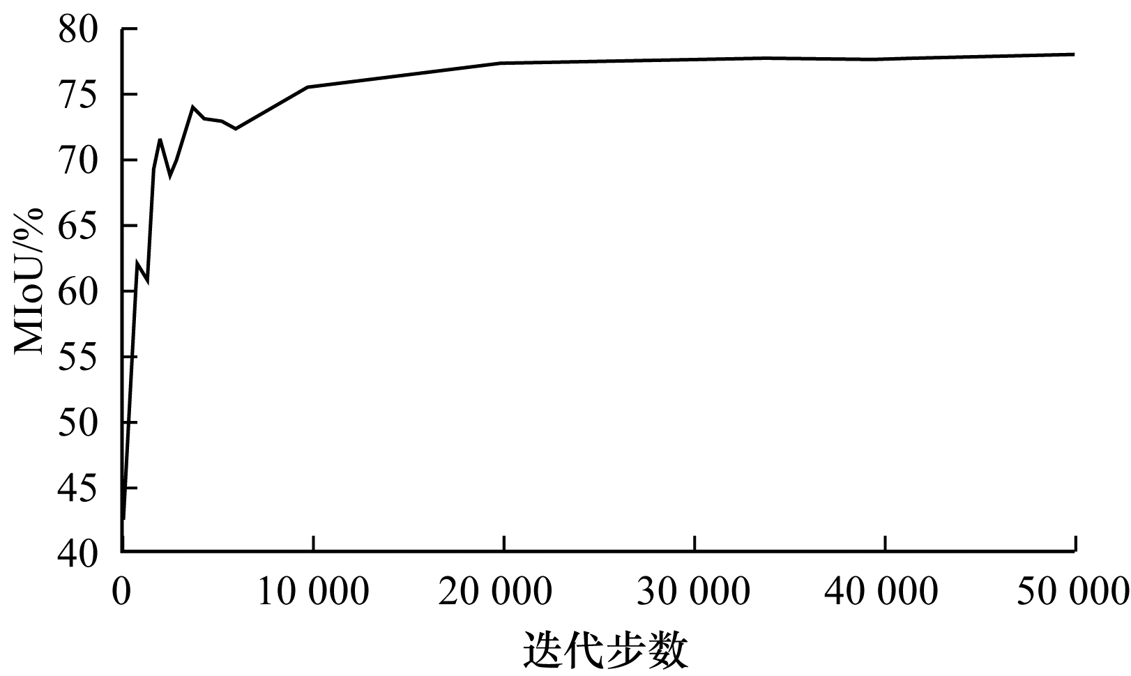 本文利用迁移学习加快训练速度, 并对公开数据集上的预训练模型初始化权值。由于遥感影像相对于自然场景数据特点不一样, 为获得最佳训练效果, 以马萨诸塞州建筑物数据集为训练集, 首先分析迭代步数对模型精度的影响, 如图 2所示。