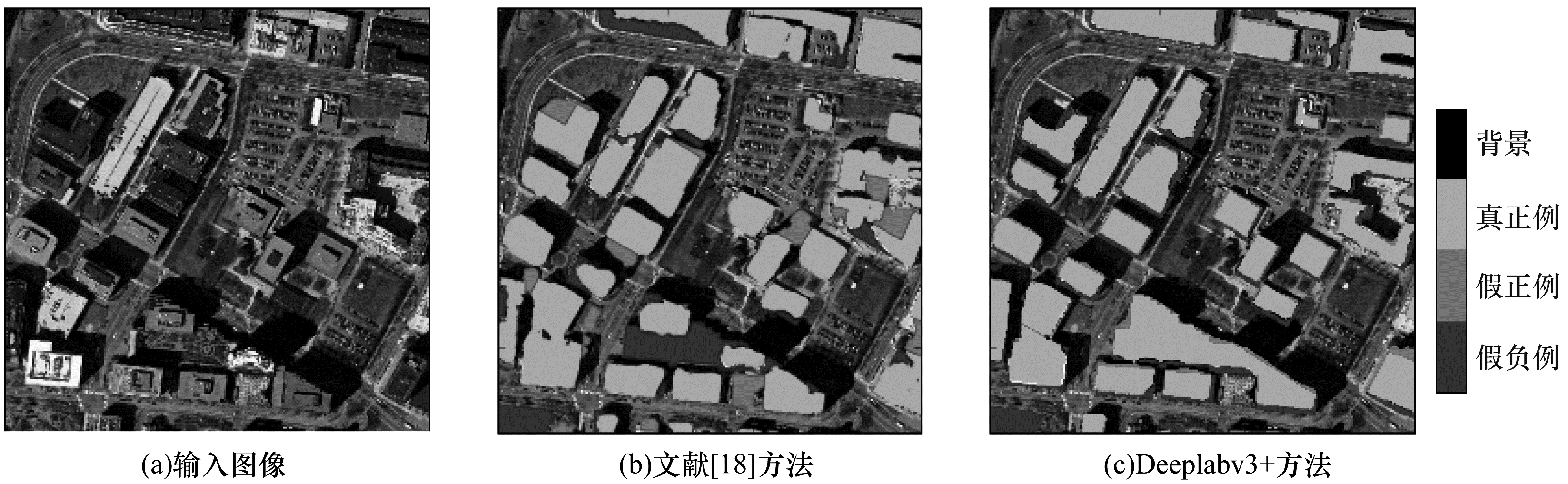 马萨诸塞州建筑物数据集由151张1.5 km×1.5 km的影像及对应建筑物标记组成, 其每张图像代表 2.25 km2区域, 总数据量覆盖约340 km2, 数据噪声率不高于5%。本文利用Deeplabv3+模型对该数据集进行训练学习, 在测试集上进行评价, 获得MIoU值为83.1%, 将其与文献[18]的结果进行比较, 如图 4所示。表 2为2种方法的准确率和召回率统计。显然, 无论召回率还是准确率, Deeplabv3+方法均要优于文献[18]方法, 这说明Deeplabv3+具有更强的鲁棒性, 处理噪声数据能力更优。