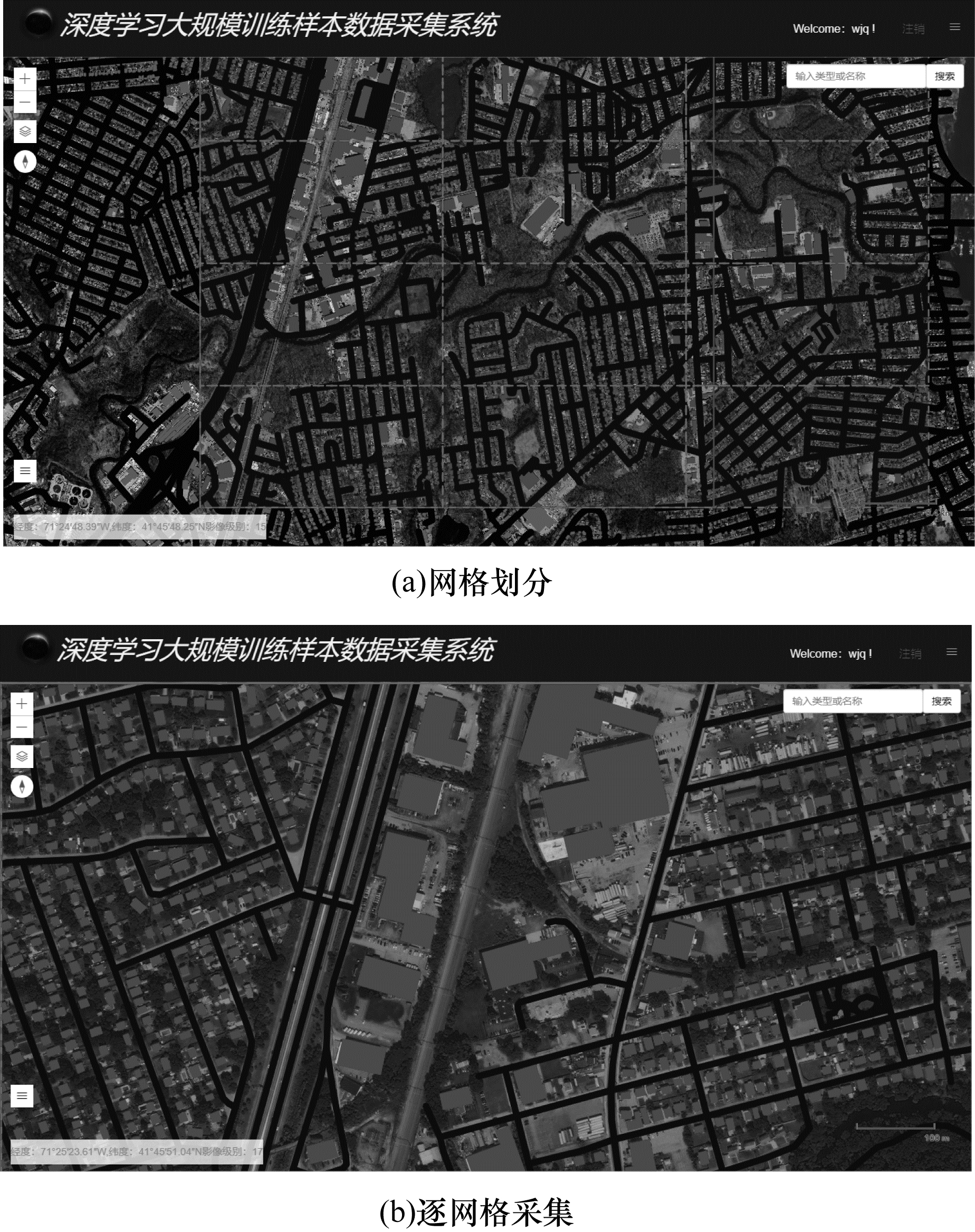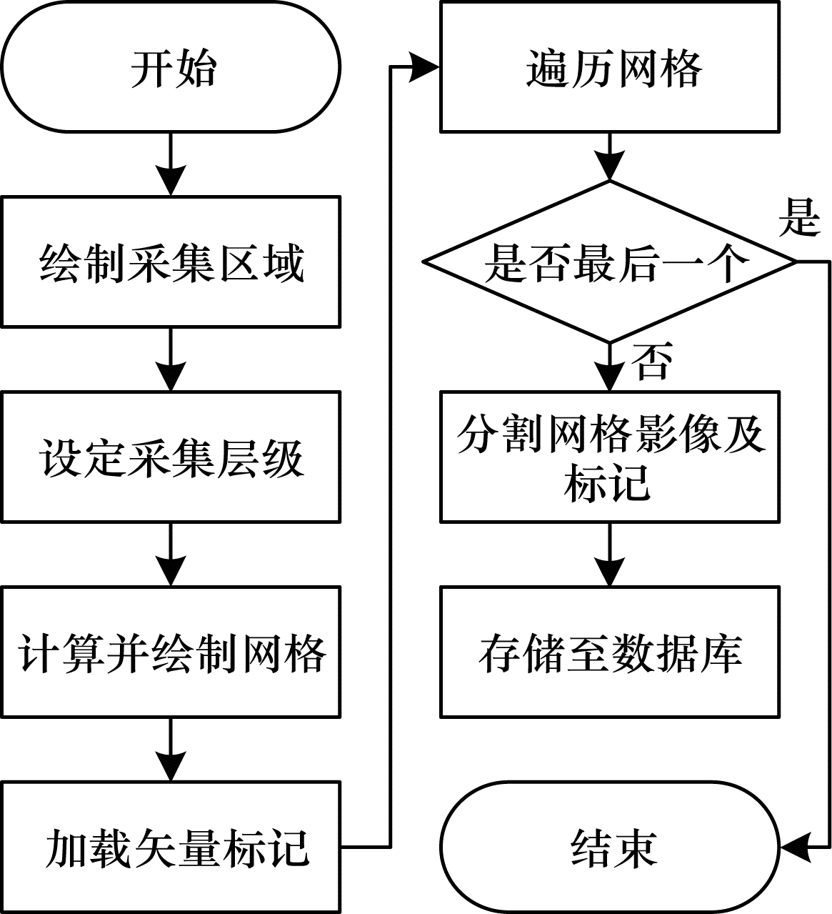 通过上述分析, 验证了Deeplabv3+可适应带有少量噪声的数据集。Deeplabv3+模型需要大规模数据集作为训练基础, 而常规方法进行标注虽然标注精度高但耗时耗力。由于数据更新的时效性问题, 公开矢量数据集Openstreetmap和影像数据不完全套合, 存在噪声, 但这种噪声可通过人工筛选降低。因此, 为解决训练样本数据集获取问题, 本文设计大规模训练样本数据采集系统, 该系统基于WebGIS实现, 通过网格划分的方式实现大区域样本数据采集, 其算法流程如图 5所示。