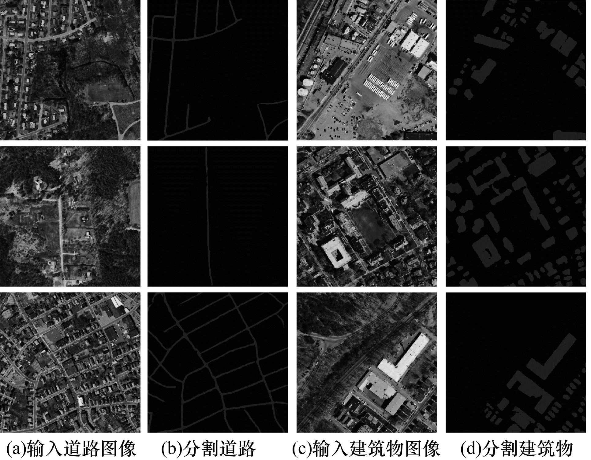 将该数据集中7 000张图像作为训练验证集, 992张图像作为测试集, 采用二次迁移训练策略进行训练, 初始学习率设置为0.002, 每20 000步衰减0.1, 学习冲量为0.9, 设置训练图像最高维度为513, APPS模块采用[6, 12, 18]3种扩展率。以交叉熵损失函数[20]作为目标函数, 采用随机梯度下降法进行训练优化, 考虑道路、建筑及背景3种标记样本数量不平衡, 在训练时对道路、建筑赋予更大权值, 三者权值比设定为2:2:1。训练50 000步后, 在测试集上进行分割精度验证, 结果显示:建筑物IoU为82.9%, 道路IoU为77.5%, 两者MIoU为80.2%。建筑物识别精度优于道路, 其原因是区域内道路标记通过线要素缓冲获取, 并不能代表真实道路边界。图 7为模型在测试集上的典型要素提取效果图。