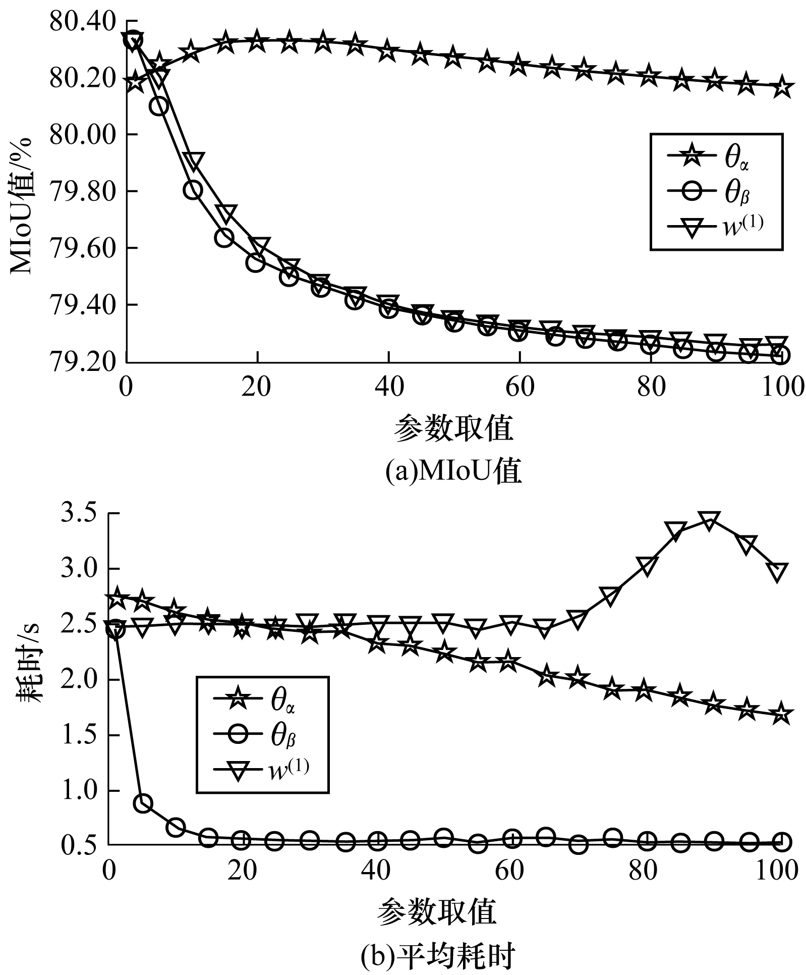 3.3 全连接CRF参数选择及效果分析本文利用网格搜索法对θα、θβ和w(1)参数进行比对实验。实验首先固定θβ=1、w(1)=1, 仅考虑θα取值对MIoU的影响, 结果如图 8(a)所示, 当θα=25时, MIoU达到最优。图 8(b)显示θα=25时单张图像推断平均耗时下降较慢, 综合考虑, 确定θα=25。其次固定θα=25、w(1)=1, 考虑θβ取值的影响, 图 8(a)显示, 当θβ=1时, MIoU为最优, 并且随着θβ增加下降较快, 图 8(b)显示θβ=1时单张图像推断平均耗时下降迅速, 综合考虑, 确定θβ=1。同理, 可比选参数w(1)=1时最优。最终, 确定θα=25、θβ=1及w(1)=1为最优参数组合, MIoU值达到80.32%, 较未加入CRF提升0.12%。