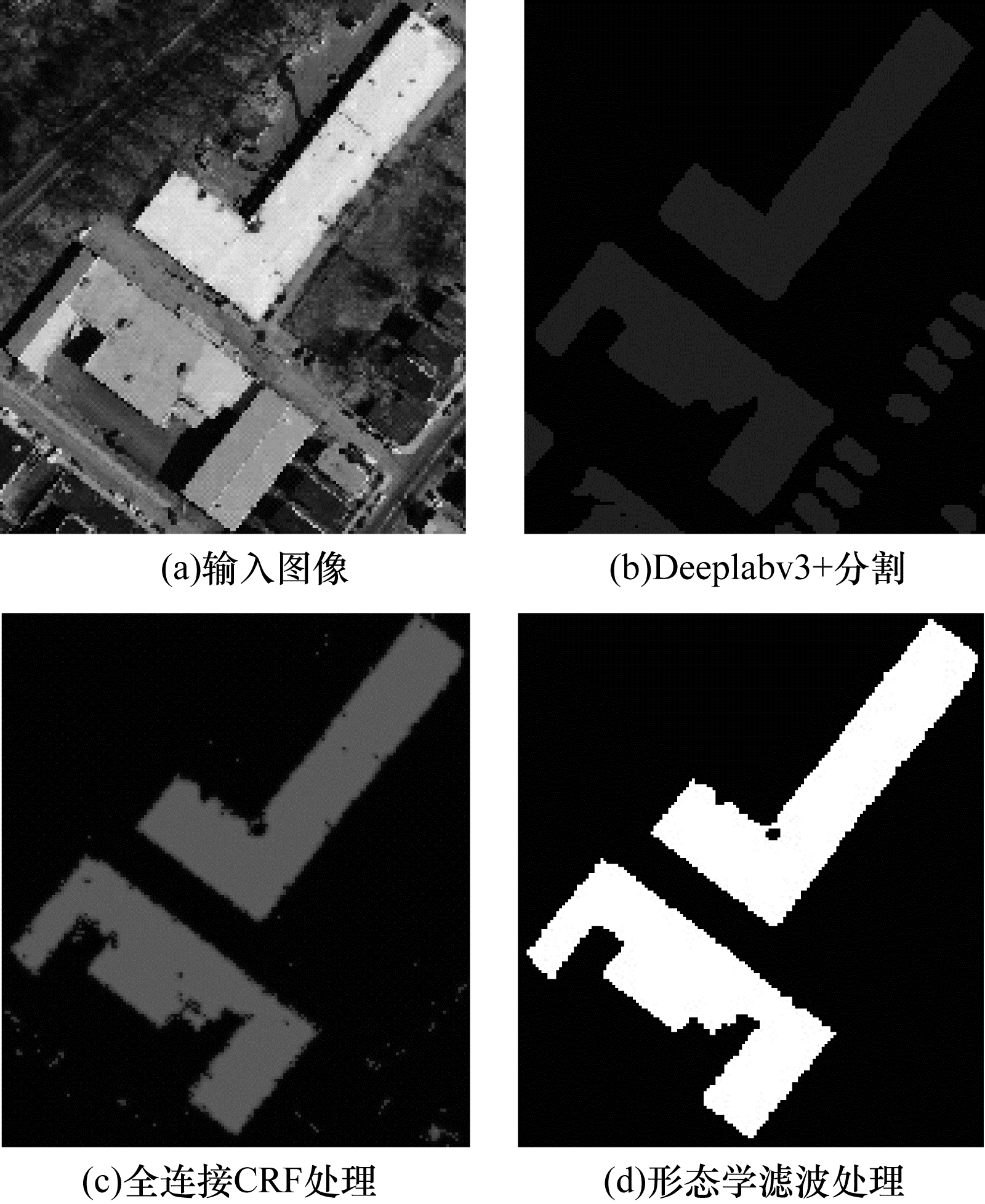 从图 9可知, Deeplabv3+分割边界较粗糙, 经过全连接CRF推理后, 边界轮廓清晰, 经过形态学滤波及闭运算操作后, 可获得最终要素边界信息, 从而实现要素的高精度提取。