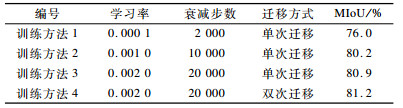 从图 2可知, 当训练一定步数后, 模型精度变化较缓慢。为此, 本文尝试双次迁移方式, 即先在预训练模型上迁移训练少量步数, 再在生成的模型上进行一次迁移。本文设计了4种训练方法分别进行训练, 其模型精度如表 1所示。显然, 方法4模型精度要优于其他方法, 达到81.2%。因此, 本文选择训练方法4作为遥感影像语义分割训练方法。
