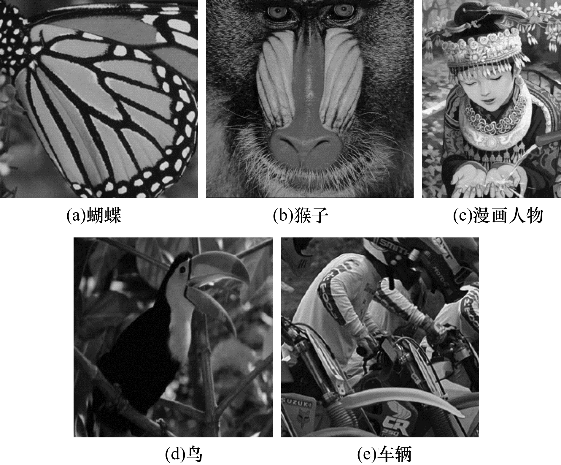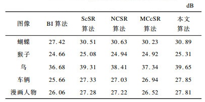 本文从标准图像处理数据库中挑选5幅图片进行测试, 如图 1所示。利用峰值信噪比(Peak Signal to Noise Ratio, PSNR)和结构相似性(Structural Similarity Index Measurement, SSIM)对重建图像的质量进行客观评价, 并与双三次插值算法(Bicubic Interpolation, BI)、ScSR算法[15]、NCSR算法[18]、MCcSR算法[21]进行对比。