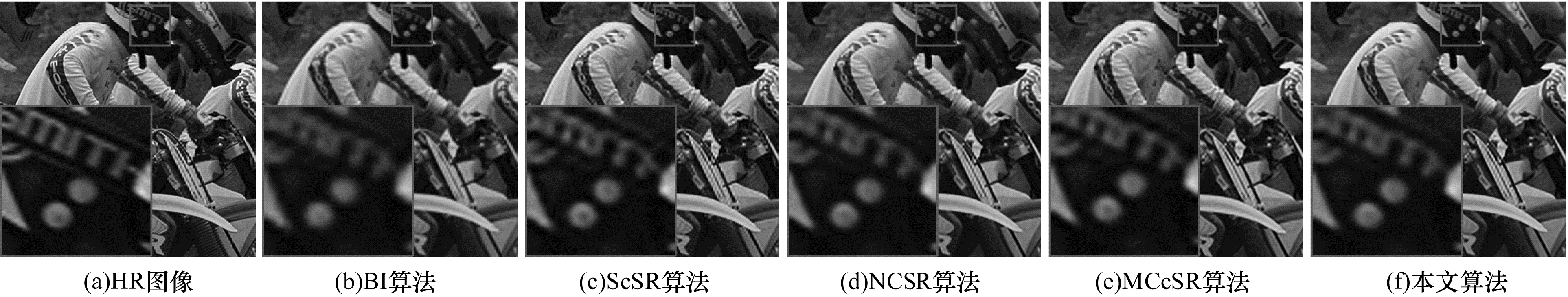 从图 3可以看出, BI算法存在很明显的模糊问题。ScSR算法重建得到的图像细节部分比较清晰, 但在边缘区域存在锯齿现象。NCSR算法的重建图像中存在一定的色彩伪影。MCcSR算法对重建图像的色彩信息实现了较好的重建, 但对局部细节信息, 如头盔部位的文字区域恢复效果不够理想。本文算法在重建图像色彩保持及图像细节恢复方面取得了更好的效果。
