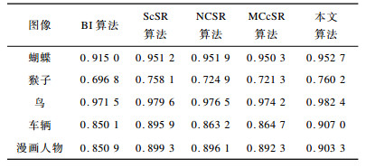 从图 2可以看出, BI算法得到的重建图像质量较差, 特别是翅膀部位的纹理边缘区域不够平滑, 存在较明显的锯齿和伪影现象。ScSR算法的重建结果较好, 但整体细节较为模糊且存在一定的色彩伪影。NCSR算法对于图像平滑区域可实现很好的重建, 但其对细节较为丰富的区域过度平滑, 导致细节信息丢失。MCcSR算法可对色彩信息实现较好的重建, 但对于图像细节的恢复表现较差。本文算法在增强重建图像边缘细节信息的同时, 可有效去除伪影, 使HR图像的视觉效果较好。
