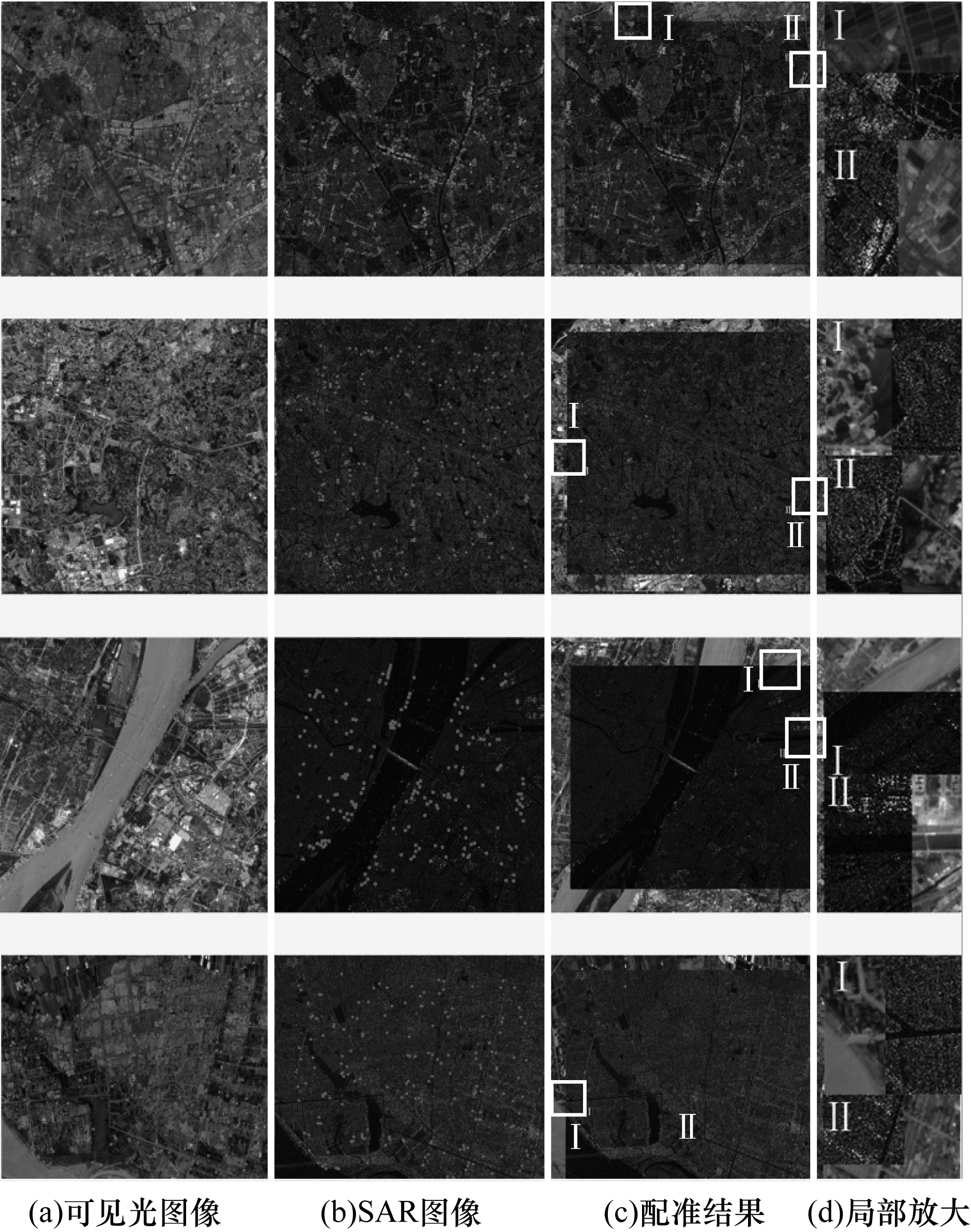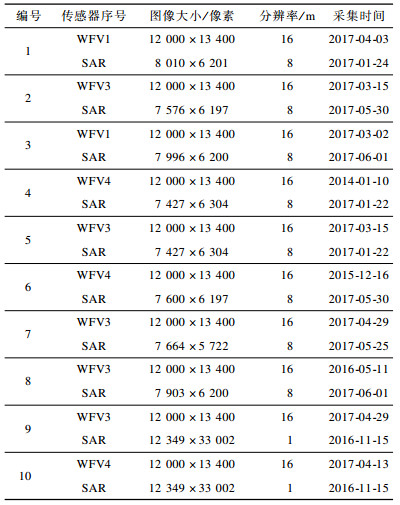 本文采用了10组遥感图像对(不同视角、不同轨道下的多种传感器所获得10幅SAR图像和10幅可见光图像)进行实验, 实验图像覆盖中国东部不同的地形地貌, 包括城市、郊区、河流和山区。实验数据集的特征如表 1所示。