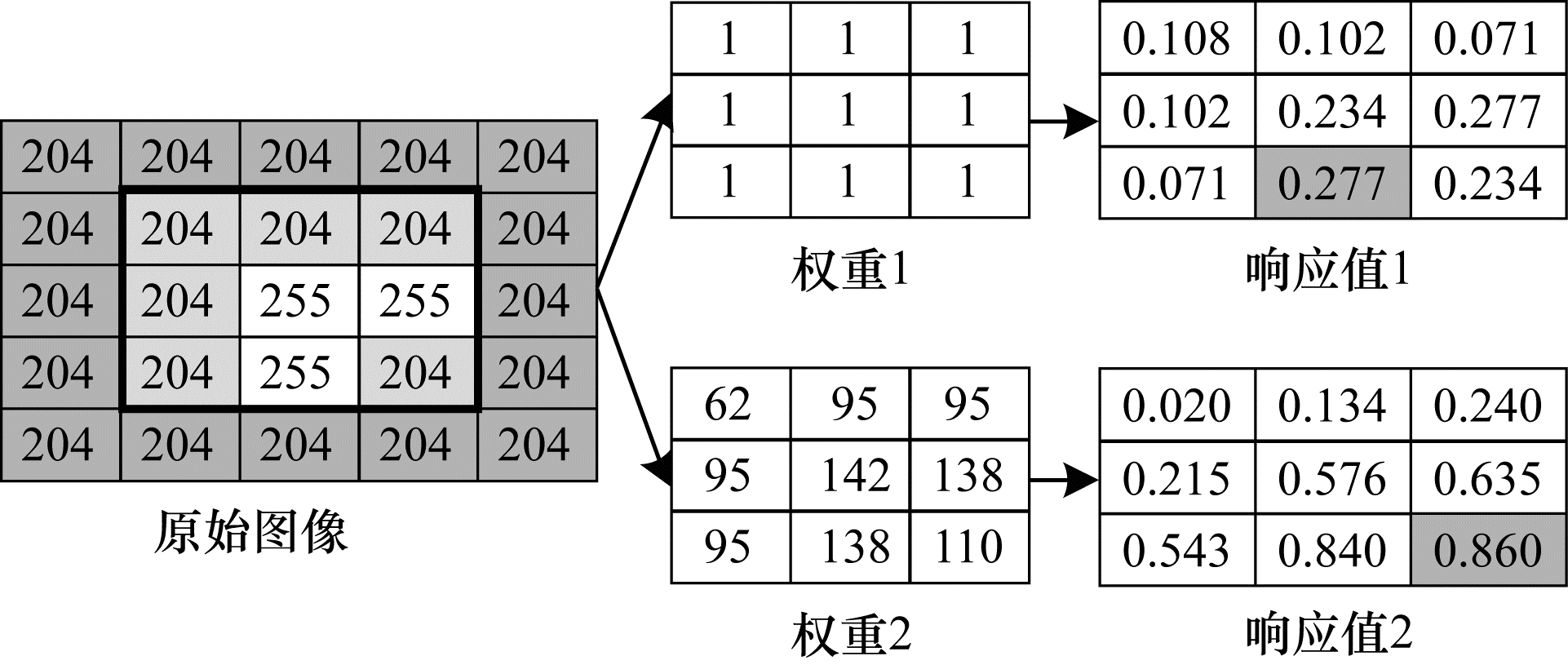 | 图 2 不同权重函数的响应值示例 | |