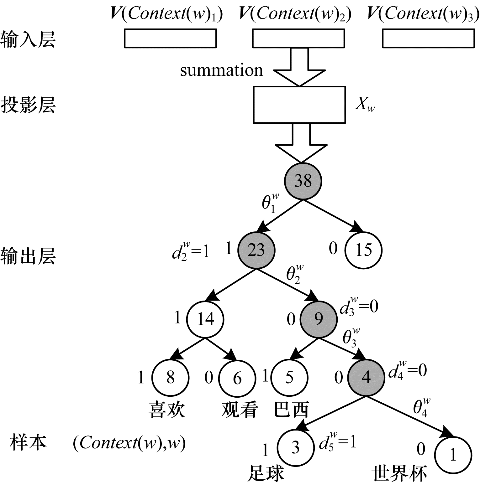 4) dw2, dw3, …, diww∈{0, 1}为词w的Huffman编码, 其由lw-1位编码构成, djw表示路径pw中第j个结点对应的编码(根节点不对应编码)。
