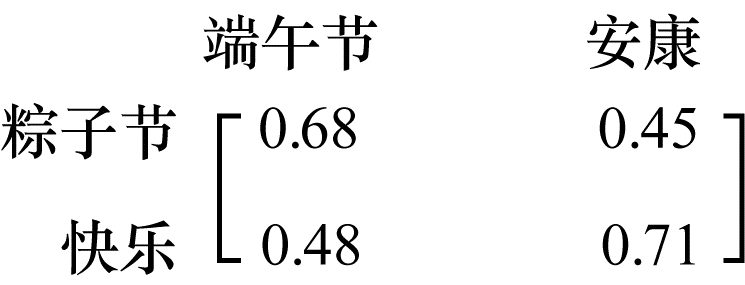 例如, 对于表 1所示的2个微博标签, 使用Word2Vec模型可以得到如图 3所示的词语相似度矩阵。遍历该矩阵, 将每行中相似度的最大值所对应的词写入词对集合, 并得到2个词集:{端午节, 安康}和{粽子节, 快乐}, 最终基于公共块算法得到2个公共块:{(端午节, 粽子节), (安康, 快乐)}。