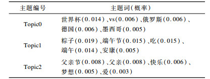 本文通过调用python的第三方库gensim中的models.ldamodel.LdaModel方法对合并后的微博文本建模。综合考虑算法的效率和准确性, 将主题个数设置为30。在LDA模型训练完成后, 即可将挖掘出的隐主题作为特征来表示微博文本。表 2给出3个LDA主题的示例。