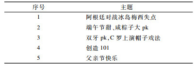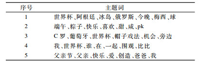 本文使用K-means方法对所有微博文本进行聚类。根据经验将K值设置为5。用聚类中心特征向量中特征值最大的主题特征表示该中心点, 选取该主题特征中概率最大的7个主题词作为聚类结果, 如表 3所示。