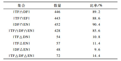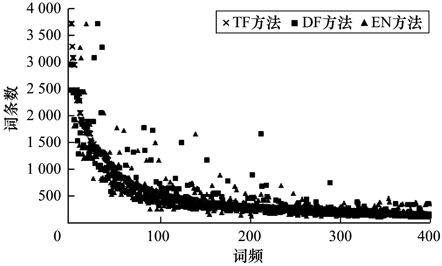 从表 3可以看出, 3种方法获取的词语基本相似。在TF方法和DF方法获取的500个词语中有446个相同的词语, 相似度达到89.2%。DF方法和EN方法有452个相同的词语, 相似度达到90.4%, 即DF方法和EN方法获取的词语基本相同, 但顺序不同。从交集结果看, 3种方法获取的词语具有85.5%的重复率, 其中DF方法与EN方法的相似度最高。