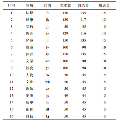 3 语料统计与分析 3.1 语料数据本文实验语料来自新疆大学多领域平衡语料库, 选用16个领域的1 408个文本(807 257词频), 语料大小为11.3 MB。将90%的实验语料作为训练集, 10%的语料作为测试集, 具体分布情况如表 1所示。