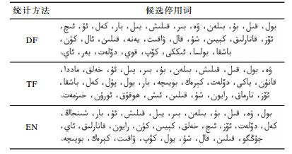 由表 2可知, 在3种方法获取的候选词语中, 大多数词语为功能词, 且3种方法的候选词表有相同点, 说明DF、TF、EN中排在前面的助动词、连词等词语可成为停用词, 符合语言学规律。但是, madda(条款)、qanun(法律)等词语只出现在TF的词表中, 这2个词语是名词, 不能作为停用词;