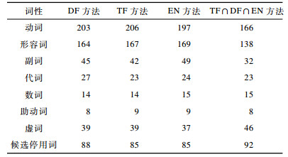 为排除不能成为停用词的实词, 需要对这些词集进行词性统计, 结果如表 4所示。