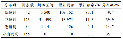 从表 5的统计数据可知, 这些词语在文本中具有两头大中间小的分布特征。其中, 使用频率高于500的词语有42个, 其累计频率(覆盖率)为85.1%, 中频词语共有173个, 约占整个语料的14.1%, 另有155个词语未在语料中出现。从停用词的性质看, 低频词和未出现的词语不需要成为停用词。因此, 在表 5统计结果的基础上, 建立包含高频词和中频词(共215个)的词集B。