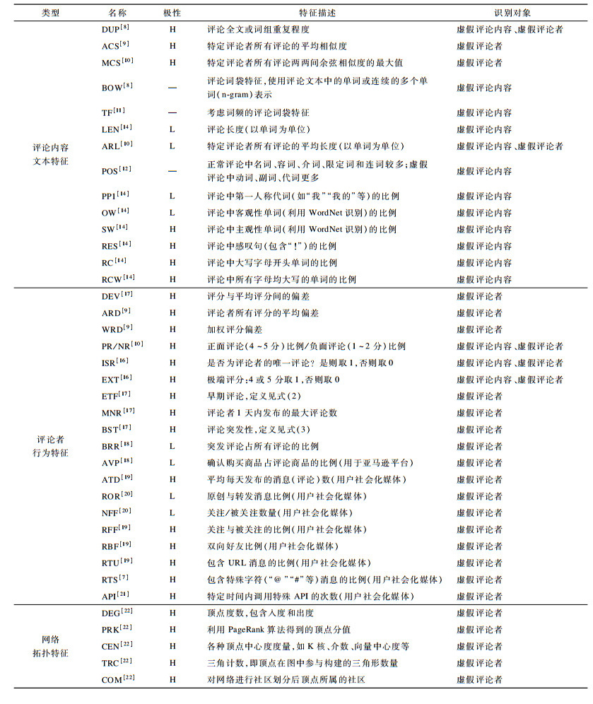 表 1总结了已有的虚假评论及其发布者识别所使用的3类特征, 分别给出了特征的名称、极性、描述、来源文献、识别对象等。其中, 极性表示特征值越高(H)或越低(L), 相应的评论或评论者虚假的概率越高, “—”表示无法获取文本特征的极性。