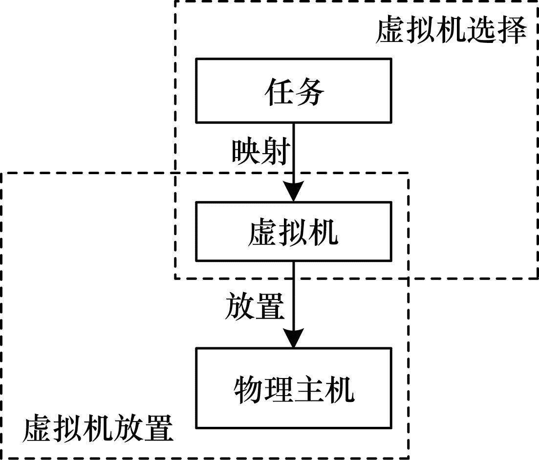 联系虚拟机选择与放置过程的主要媒介是虚拟机。尽管虚拟机具有重要作用, 但笔者认为其仅是一个用来映射客户端任务到物理节点的工具, 必须具有安全性与可管理性。客户端的目的是为任务寻找物理主机, 云服务提供商的目的是利用云数据中心的物理节点承担大量的客户端的工作负载, 虚拟机可以认为是封装任务的包裹, 在云平台中该包裹可以按照一定的价格进行计算。