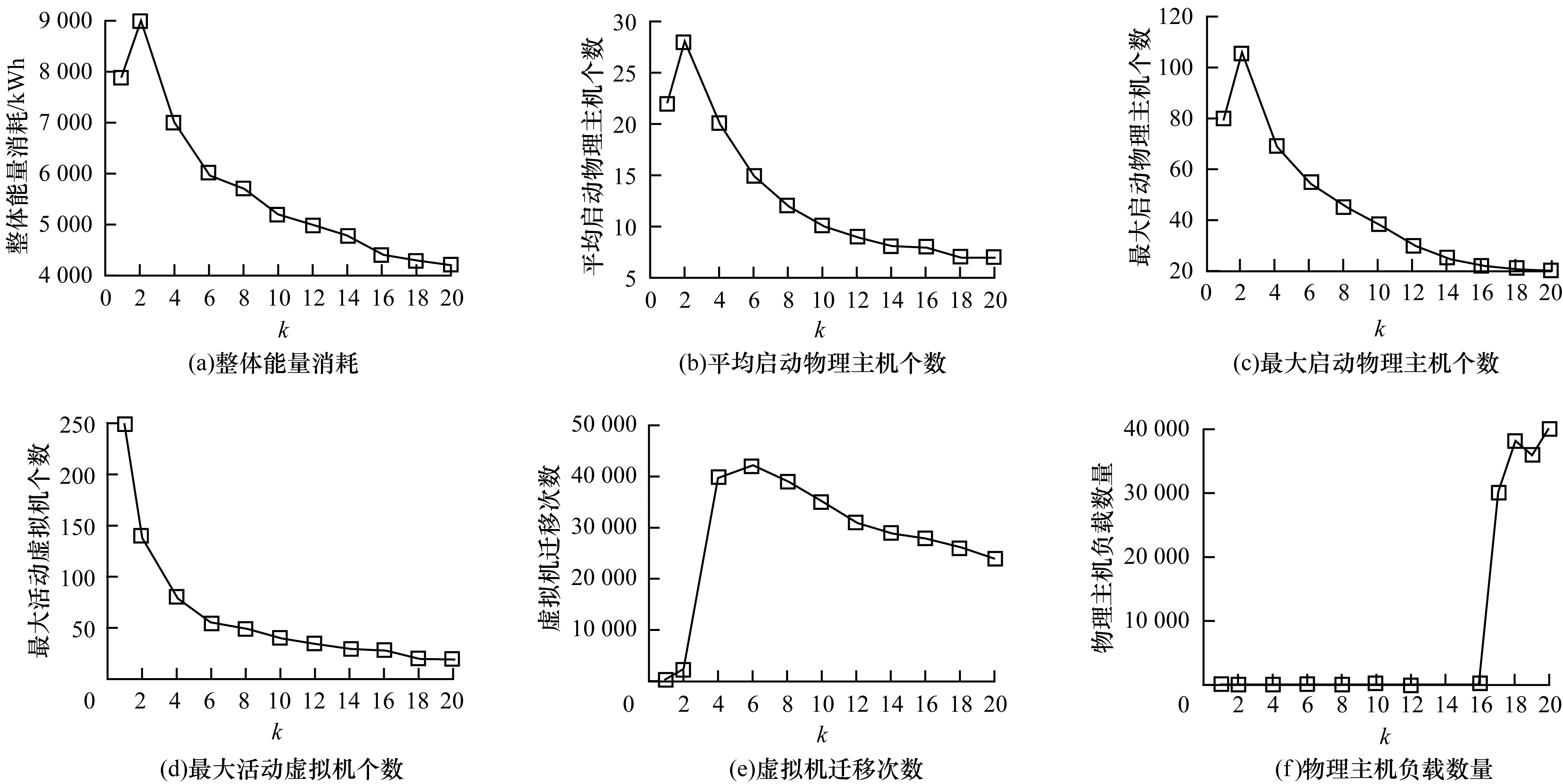 4.2 Simple与Multiple(k)算法性能首先测试Simple和Multiple(k)虚拟机选择算法的性能, 按照上文描述Multiple(1)与Simple算法是一致的, 实验结果如图 3所示。从中可以看出, 云数据中心整体的能量消耗和启动的物理主机平均数量及最大数量都在开始时上升, k=2时开始下降, 得到这个结果是因为k=2是拐点, 随着k的增加, 虚拟机尺寸都随着虚拟机个数的增加而降低, 这样一方面会导致虚拟机迁移机会减少, 另外一方面也会使能量消耗减少。基于这些性能指标, k值的增加可以提高系统的性能。而从图 3(e)和图 3(f)中可以看出, 超负载的物理主机的数量在k=16时数量急剧增加, 虚拟机迁移的次数在k=4时少量增加, 这些都是系统性能降低的表现。因此, 从图 3中可以看出, 为了使这6个指标平衡, k的最佳值应为3。Multiple(k)虚拟机选择算法的最大问题就是k值选取导致迁移次数增加及启动物理主机数量增加的不可预测性及不可控制性, 这些因素也包括物理主机的计算能力与负载的大小。因此, Multiple(k)算法有一定的风险, 设置较小的k值才比较安全, 但k值设置较小往往会降低云数据中心的整体性能。