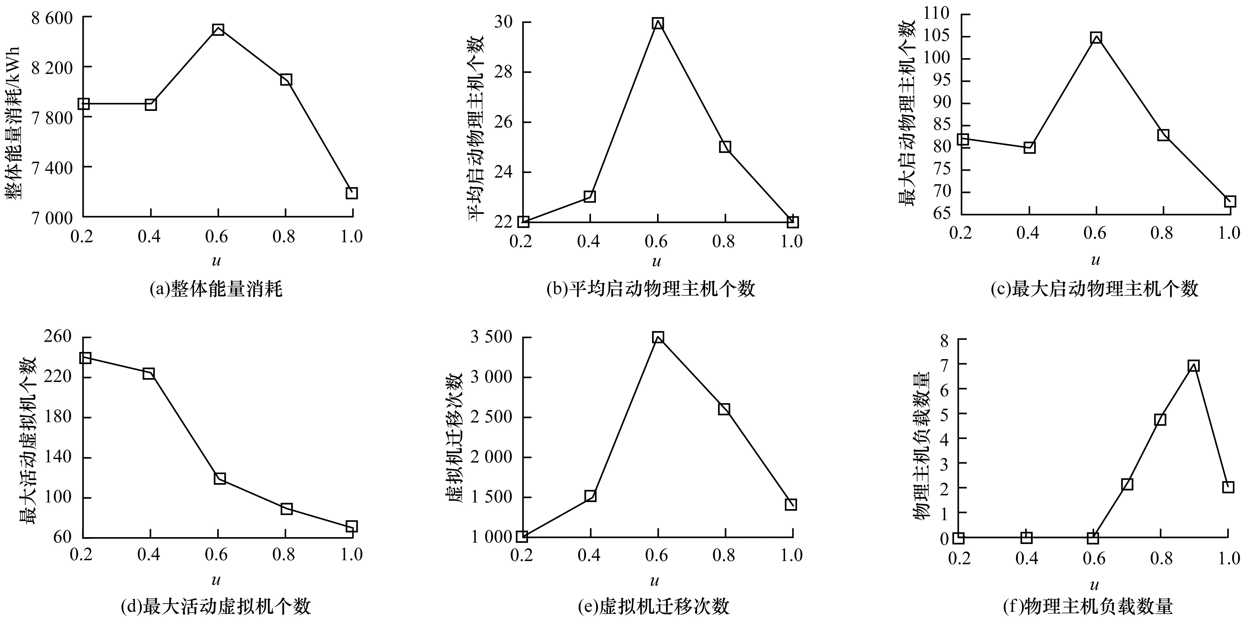 Maxsize(u)算法的最大特点是更改u的值与任务映射方法, 本实验中设置了6个u的值(u=0.25, 0.3, 0.5, 0.6, 0.9, 1.0)。任务映射按照首次适应算法First Fit, 各种组合的实验结果如图 4所示, 其中每个数据点表示了一个u值。与Multiple(k)相比, Maxsize(u)算法的各个组合都没有引起的性能急剧变化, 该算法优点是物理主机的计算能力可以更好地控制物理主机的利用效率, 是一个比较无风险的算法。只有图 4(e)和图 4(f)显示性能有较大的波动, 但与Multiple(k)相比, 这些少量的性能波动是很小的一个范围。