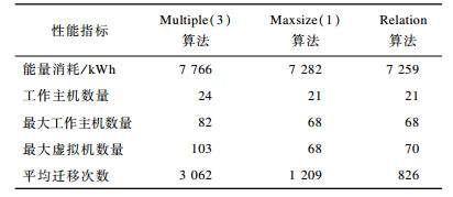 Multiple(3)、Maxsize(1)与Relation算法的性能比较如表 1所示。从中可以看出:Relation算法多数性能优于Maxsize(1)和Multiple(3)算法; Relation算法的在虚拟机迁移次数、能量消耗、启动物理主机个数等方面优于Multiple(3)和Maxsize(1)算法, 因为其考虑到更多的虚拟机选择和虚拟机放置的组合。