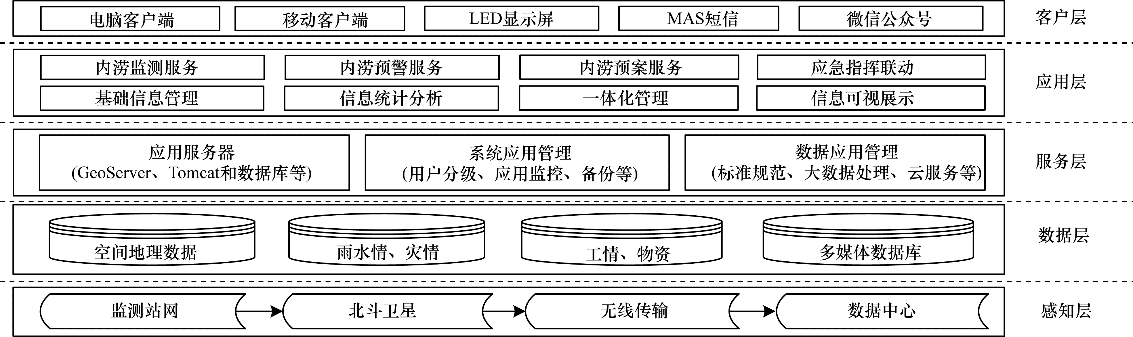 1) 感知层由自动化监测设备、遥测终端和北斗卫星等组成。数据采集除传统的自动化水文遥测站、视频监控、传感器等监测设备外, 通过北斗终端的短报文通信提供全天候实时内涝监测数据采集。