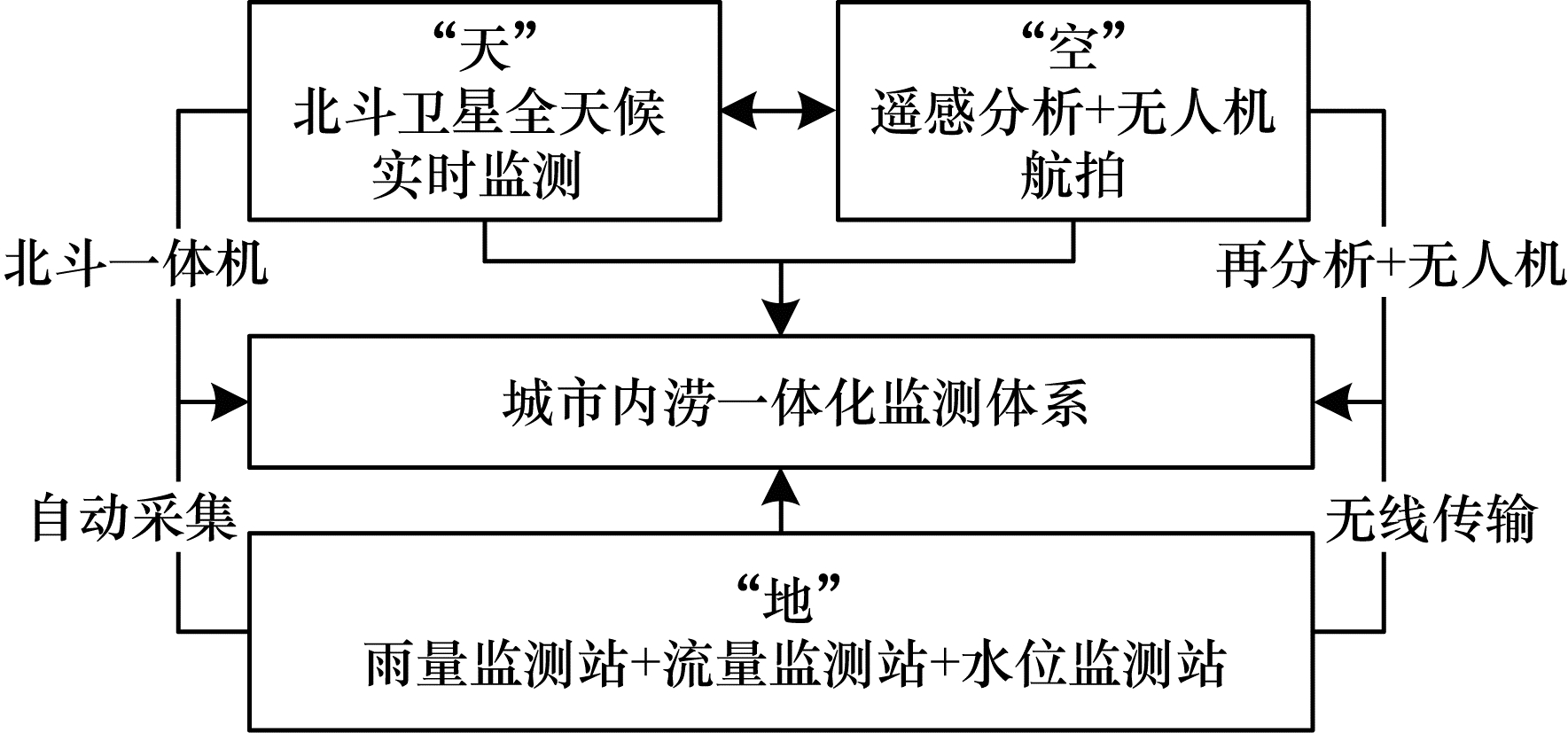 1.2 天地空一体化监测体系前端通过构建天地空一体化的监测体系, 为系统提供全天候、实时数据资源, 如图 2所示。其中:“天”指将北斗卫星系统应用到城市内涝监测中, 北斗卫星导航系统自2012年正式运行以来得到广泛应用, 基于北斗卫星导航系统的定位和短报文等功能开展内涝监测[12-13]; “地”指根据城市易涝点分布情况, 科学布设雨量、流量和水位等信息的自动监测设备, 数据传输采取无线和北斗短报文2种形式; “空”指综合应用多种卫星遥感影像数据, 并进行动态更新, 局部区域可采用无人机航拍等方式采集数据, 将采集的数据进行再分析, 筛选城市易涝点, 采用瓦片金字塔等技术将遥感和航拍影像进行瓦片化处理, 在此基础上构建城市可视化集成环境。