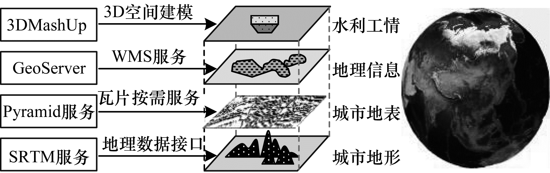 1.4 城市三维可视化集成环境本文采用多源信息融合、瓦片金字塔和数据缓存等技术为系统搭建一个高效运行且具有丰富表现力的城市可视化集成环境, 开展城市内涝基础信息分析、监测、预警和应急管理服务, 如图 3所示。利用瓦片金字塔技术将海量空间数据进行瓦片化处理, 按瓦片规则进行存储和调度, 实现对海量地形和影像数据的无缝拼接, 采用数据缓存技术实现空间数据高效管理和科学调度, 支持过程可视化的应用服务[14]。通过标准化数据通信协议和空间信息规范将内涝数据资源库接入到系统中, 对空间地理信息和内涝数据资源进行科学组织与管理, 提高数据访问能力, 提供一个高效并具有丰富表现力的可视化集成环境, 实现城市内涝在线监测预警、实时预警和情景应对等功能。
