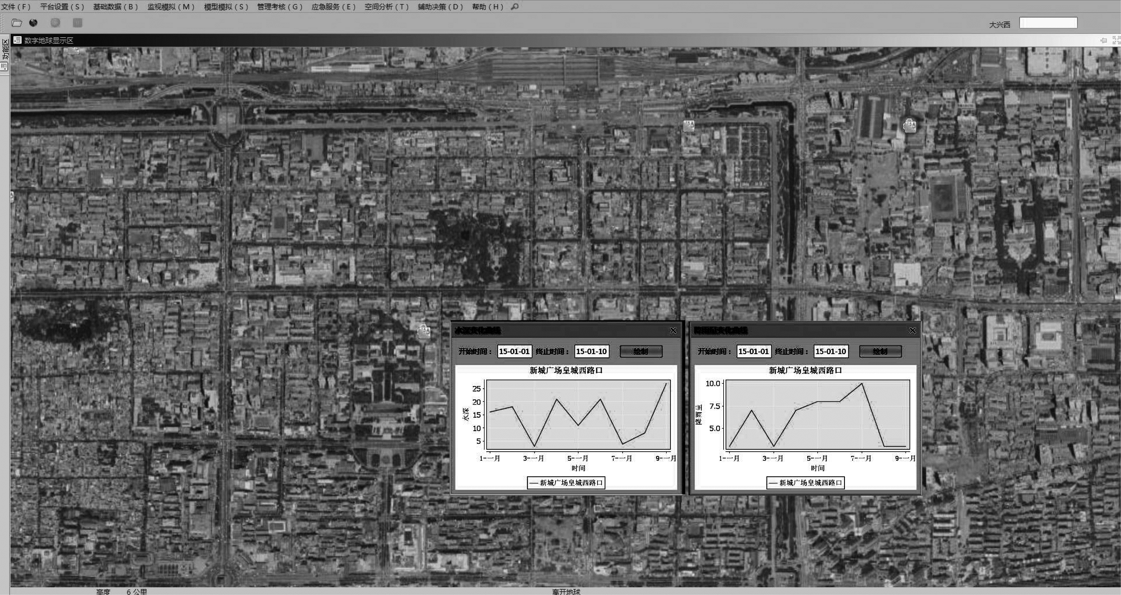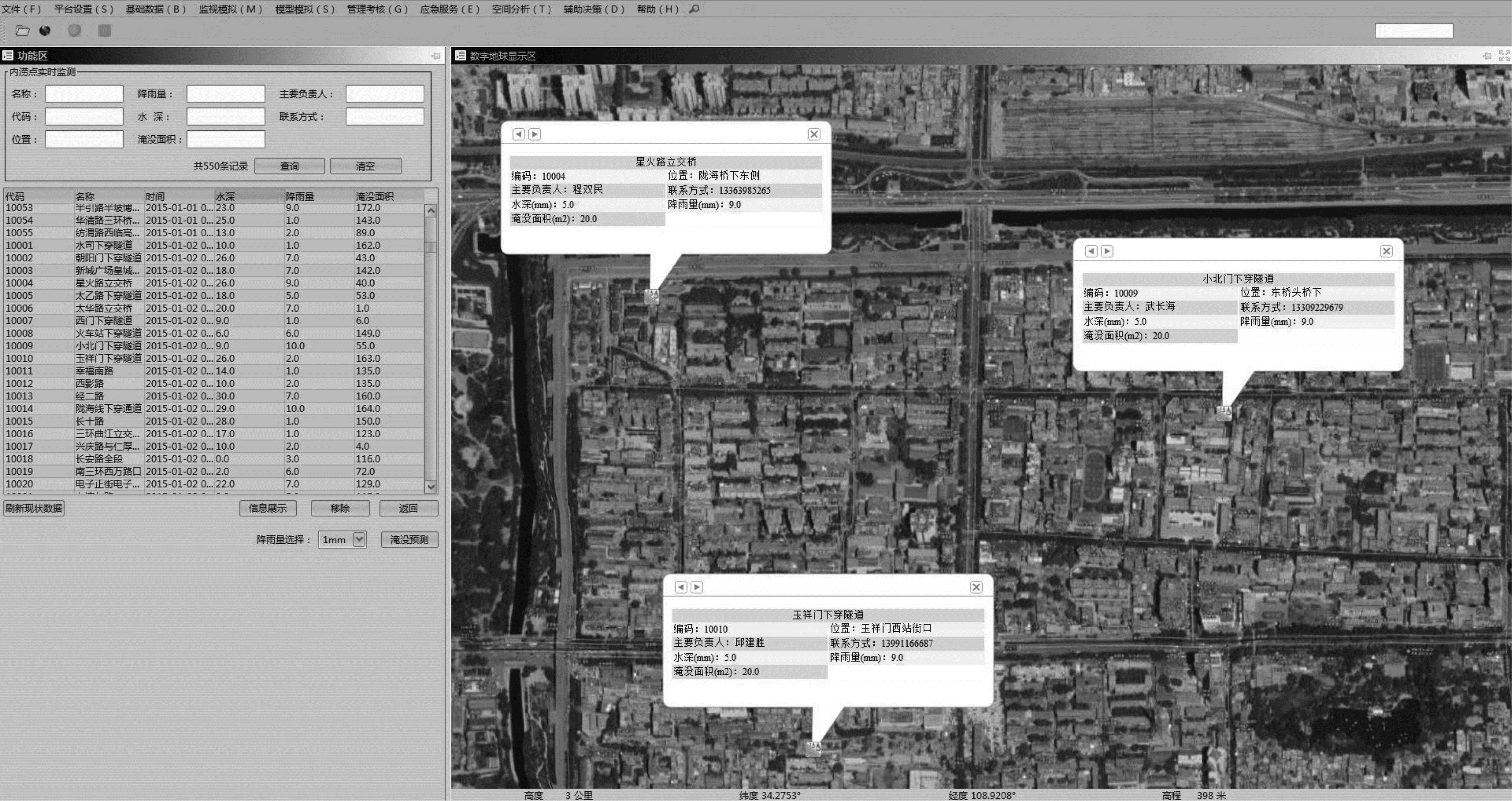 2.2 系统应用在前期开展的针对近年来西安市内涝事件变化特征及成因分析基础上[5], 本文研发西安市内涝三维可视化应急管理信息系统, 为西安市内涝应急管理和科学应对提供决策支持, 提升西安市防洪减灾能力, 降低西安市内涝灾害损失。按照模块化设计思想, 结合西安市实际情况, 重点从信息分析、内涝监测、内涝预警、内涝应对预案等功能模块进行应用。