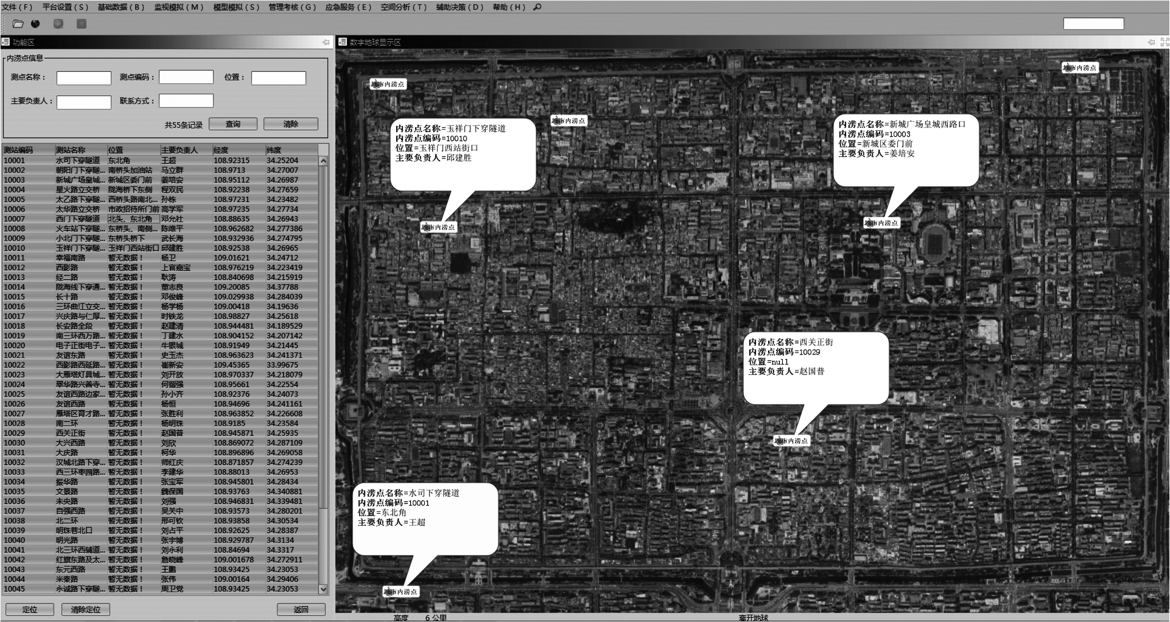 图 4所示为系统的信息分析模块。该模块对1.2节中监测采集和整合的数据资源进行深度分析和挖掘, 对城市内涝基础信息进行查询和可视化展示。对海量实时的城市气象水文等数据进行查询和计算分析, 分析历史变化规律, 预估其未来发展趋势。基于系统实现西安市主要低洼易涝点、排水设施、防汛人员和物资储备空间分布情况的可视化展示。采用系统的空间分析功能对内涝应急管理和应对人员、机械和物资等进行科学调配, 缩短应急响应时间, 节约管理成本。