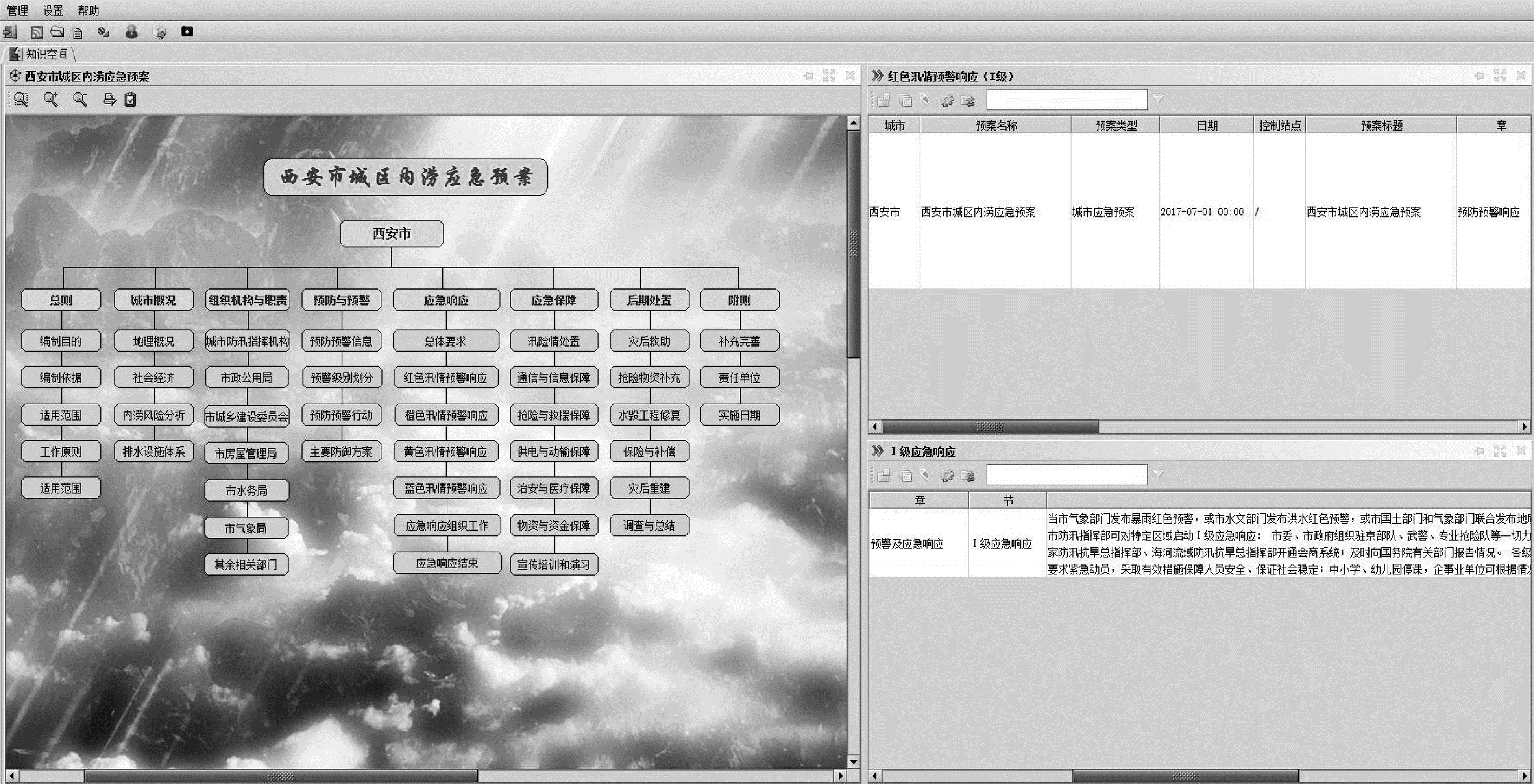 图 7所示为系统的内涝预案模块, 基于系统对传统的文本预案进行数字化处理, 形成可复用的组件化预案, 采用组件技术对数字化预案进行开发, 使得数字预案形成松散耦合的结构。根据分析所得的内涝预警信息、降雨发生范围、危害程度和预警级别, 确定城市内涝应急响应4个等级, 建立各等级预警信息与人防、物防、技防相结合的内涝应对预案[9]。基于系统对组件化预案进行分析和研讨, 制定城市内涝全过程的应对方案。事件发生时, 基于系统的预案模块为应急管理人员提供视频联动会商服务, 通过会商制定应对方案, 提高内涝事件应对的时效性, 快速响应, 减少灾害损失。