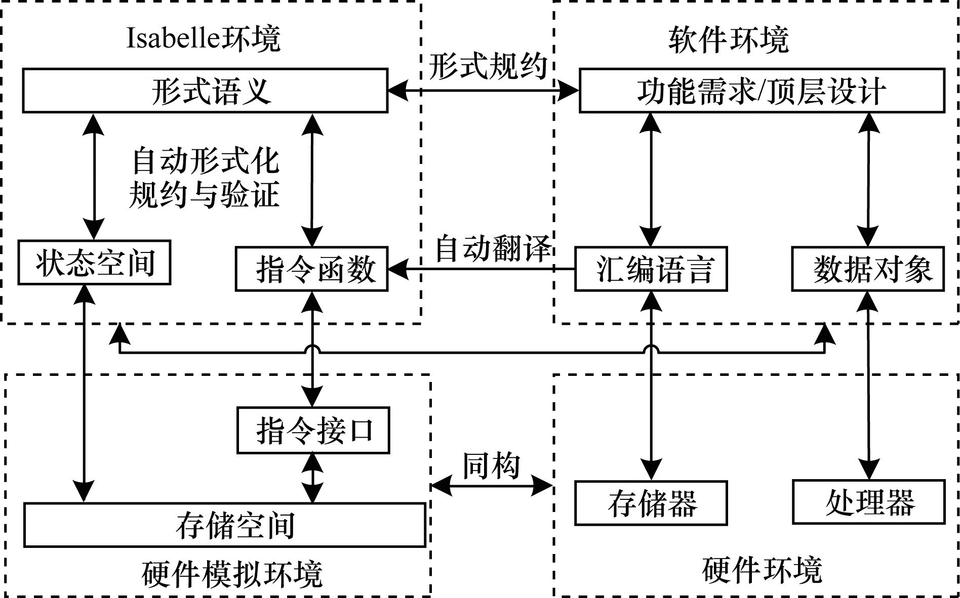 2 自动证明系统架构与模型软件实际运行是在硬件环境的存储器和处理器支持下完成的, 本文以交互式定理证明器Isabelle作为验证工具, 所构建的自动证明系统架构与模型如图 1所示。首先在Isabelle环境下建立与硬件环境同构的系统模型, 并定义为一个软件的工作对象集合——状态空间, 其由代码C、内存数据D、处理器和设备控制器的寄存器的集合等各种存储单元组成。此外, 在Isabelle环境下还需建立与硬件架构相对应的指令接口模型。