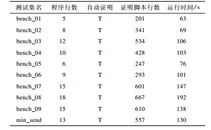 在表 1中, 第1列表示选择的测试集名, 第2列表示测试集的程序行数, 第3列表示所生成的证明脚本能否在Isabelle2017中验证通过(T表示通过), 第4列表示证明脚本的行数, 第5列表示验证每个测试集所用的时间。实验结果表明, 本文所提出方法具有较高的可行性。