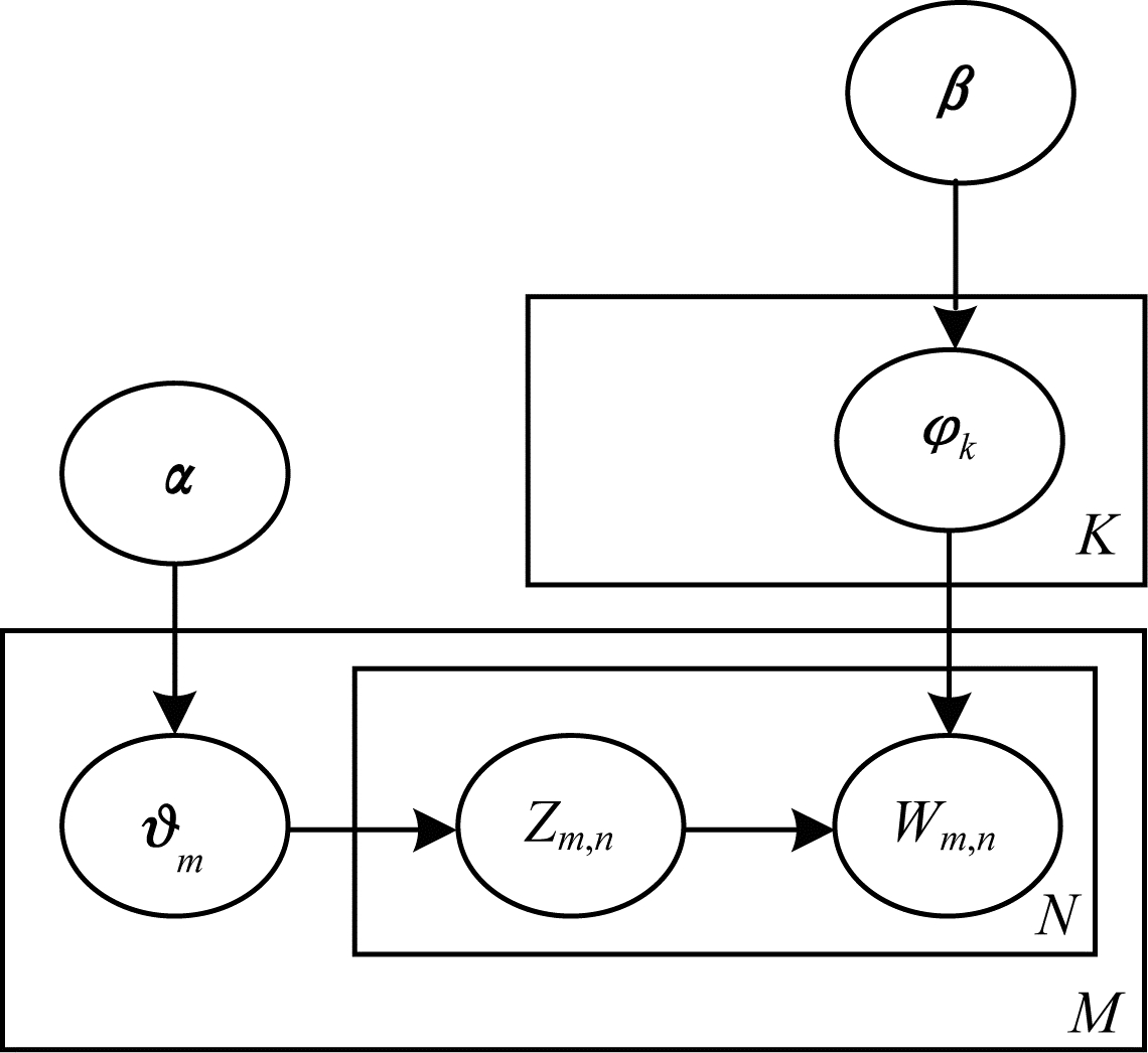 $ \begin{array}{l} p\left( {{\mathit{\boldsymbol{w}}_m},{\mathit{\boldsymbol{z}}_m},{\mathit{\boldsymbol{\vartheta}} _m},\mathit{\boldsymbol{\phi}} |\mathit{\boldsymbol{\alpha }},\mathit{\boldsymbol{\beta }}} \right) = \\ p(\phi |\mathit{\boldsymbol{\beta }})\prod\limits_{n = 1}^{{N_m}} {p\left( {{w_{m,n}}|{\bf{\mathit{\boldsymbol{ \pmb{\mathsf{ φ}} }}}},{z_{m,n}}} \right)} p({z_{m,n}}|{\mathit{\boldsymbol{\vartheta}} _m})p\left( {{\mathit{\boldsymbol{\vartheta}} _m}|\mathit{\boldsymbol{\alpha }}} \right) \end{array} $ | (1) |