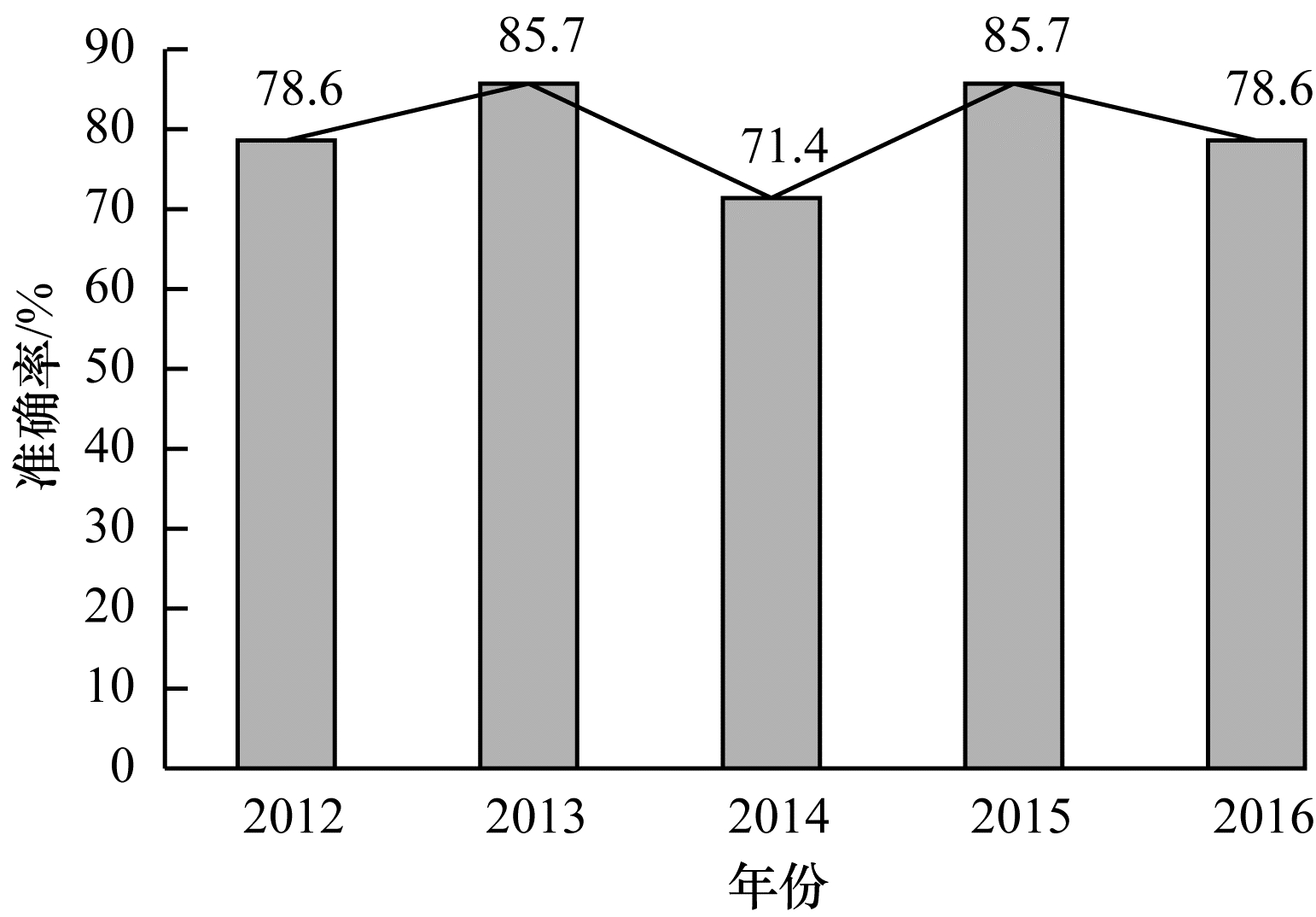 在2012年至2016年期间的基础语料库上进行学术论文研究热点挖掘实验, 计算各个年份的主题排序准确率如图 4所示。从实验结果可以看出, 除2014年以外, 其他年份中主题排序的准确率都在78%以上。综上所述, 本文方法可以得到更有意义及价值的热点主题。
