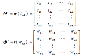 由LDA模型可以得到两个概率分布矩阵:文档-主题概率分布矩阵Θ和主题-词概率分布矩阵Φ。借鉴文献[16]利用TF-IDF的思想, 将其转化成文档-主题评分矩阵Θ′和主题-词评分矩阵Φ′, 表示如下: