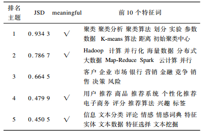 表 4是在LDA得到的概率矩阵的基础上, 将其转换成评分矩阵, 经过背景主题排序后的结果, 其中, JSD是学术热点与背景主题的归一化离散度, “meaningful”是人工根据代表热点的特征词对该主题做出的评价指标, √表示热点主题具有现实意义和解释性。