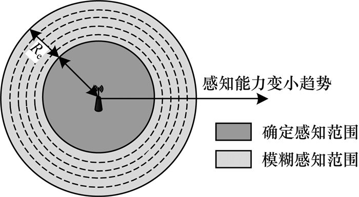 其中, λ、β为感知概率系数, Rs为感知节点的确定感知半径, Re为模糊感知范围, 节点模糊感知示意图如图 1所示。
