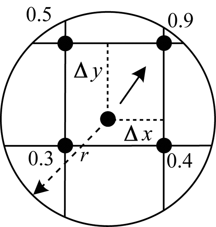 每一次迭代, 粒子中每一个感知节点以搜索半径r搜索邻域内的网格点, 搜索方程如下: