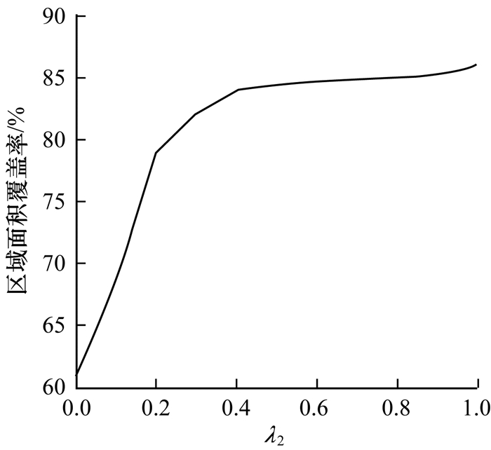 3.1 算法参数估计WFSPO算法在选取粒子评价函数时, 引入了加权覆盖率, 用于调节网格点权重覆盖率和区域面积覆盖率。前者粒子进化时倾向于权重较大的网格点, 而后者粒子更关注区域整体的覆盖情况。而权重参数λ1、λ2的选取直接影响算法的最终结果。因此, 本文在保持其余参数恒定的基础上, 分析不同λ2取值下的区域面积覆盖率情况, 如图 3所示。