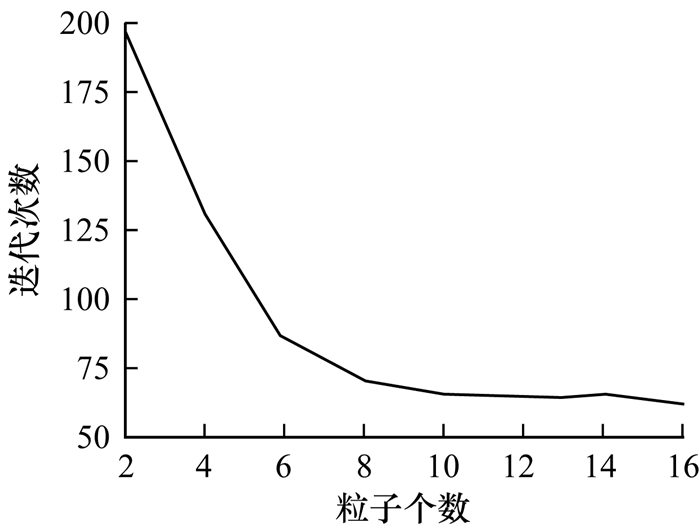 粒子群算法利用粒子的运动性来搜索空间最优, 过少的粒子会使得粒子方向感减弱, 算法随机性过大, 但由于粒子运动的社会认知、自我认知以及权重引力等因素, 粒子运动存在趋势性, 过大的粒子数对算法的增益有限, 反之带来算法迭代的冗余。综合考虑, 本文确定粒子数为10, 对算法做进一步仿真。
