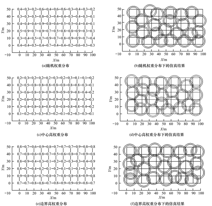 就加权覆盖率而言:区域网格点权重覆盖率是区域内网格点权重在总权重中的占比, 由于高权重网格点对整体覆盖率的贡献大, 因此在该模型上, 算法更易于优先覆盖高权重点, 以保证重点区域的k覆盖; 区域面积覆盖率的计算是为了防止重点区域内节点的过度冗余减小整体覆盖面积, 其中, 权重系数的选取对算法结果产生一定的影响。