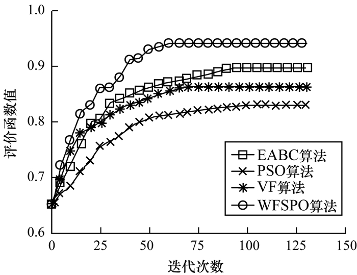 3.3 性能分析为进一步分析算法性能, 本文将标准粒子群优化(Particle Swarm Optimization, PSO)算法、虚拟力(Virtual Force, VF)算法[8]、外推人工蜂群(Extrapolation Artificial Bee Colony, EABC)算法[6]和本文WFSPO算法进行仿真对比, 如图 6所示。