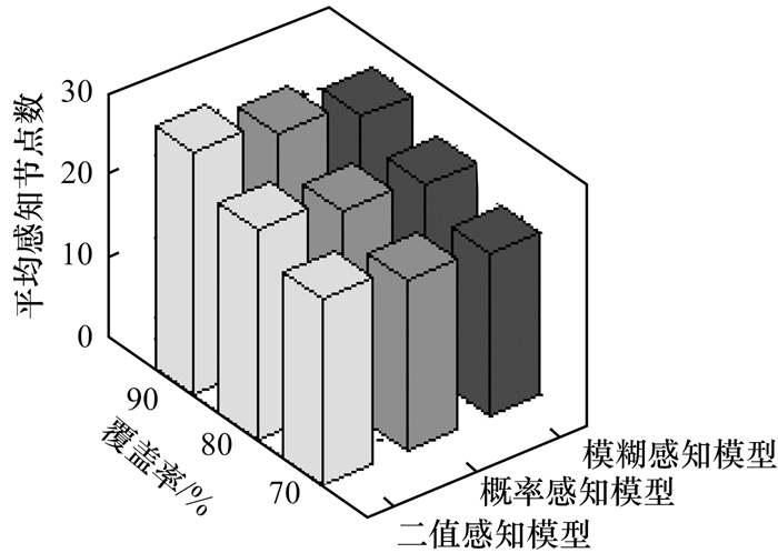 通过仿真, 对比传统的二值感知模型、概率模型和本文的模糊感知模型在满足相同区域面积覆盖率的基础上, 所需要的平均感知节点个数, 结果如图 7所示。