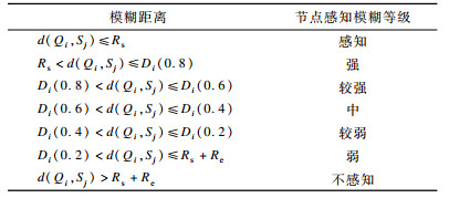 结合模糊距离判断式对节点模糊感知范围进行模糊化, 映射7种不同的感知模糊等级, 如表 1所示。