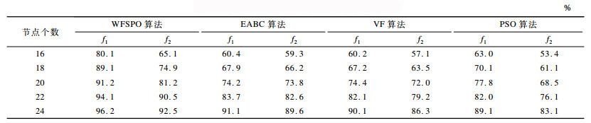 表 2给出了在100 m×50 m的区域下, 不同感知节点个数下的各算法运行后的覆盖情况, 其中, f1代表区域权值覆盖率, f2代表区域面积覆盖率。显然, 随着节点个数的增加, 区域的覆盖率也随之提高。由表 2可以看出, 本文的WFSPO算法在区域覆盖上的表现均优于其他3种算法, 尤其在重点区域覆盖上, 本文算法考虑到了重点区域的优先覆盖, 能够保持较高的重点区域覆盖率, 且当节点数量越少时, 这种优势越明显。例如, 当N=16时, WFSPO算法的区域权值覆盖率比EABC算法、VF算法、PSO算法平均提高30%左右, 其他3种算法由于没有区分区域重要性, 其在重点区域的覆盖上表现出一定的随机性。