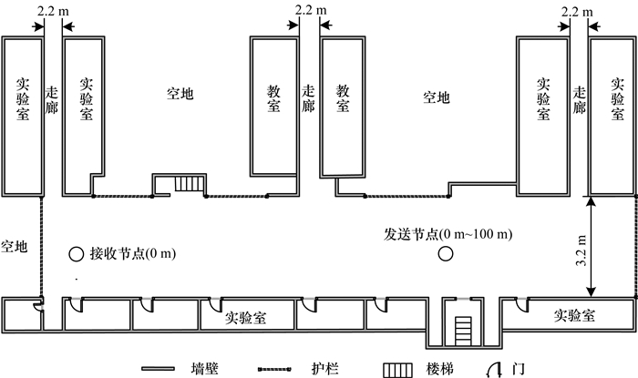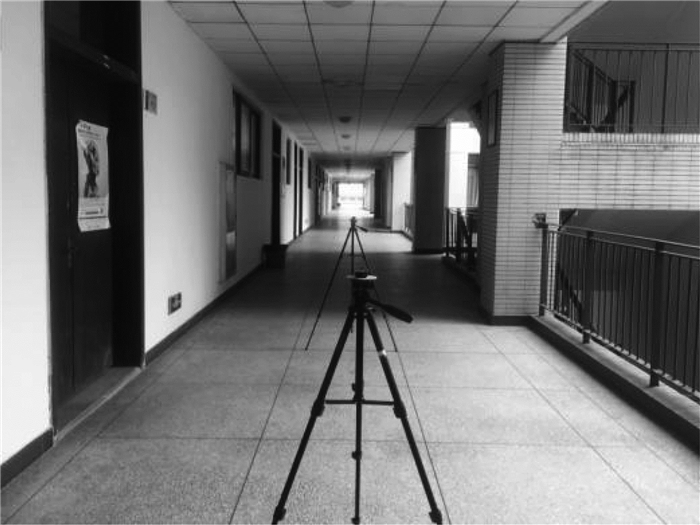 本文的实验场地位于重庆理工大学第一实验楼3楼, 半封闭走廊平面结构如图 1所示。这是一栋常见的E字型建筑, 其走廊一侧为实验室的墙壁和门, 另一侧部分为护栏, 护栏外侧空旷无遮挡。走廊长106 m、宽3.2 m、高2.8 m, 走廊内较为整洁, 几乎没有障碍物, 如图 2所示。发射和接收设备部署在走廊的中间位置, 固定在可升降的三脚架上。